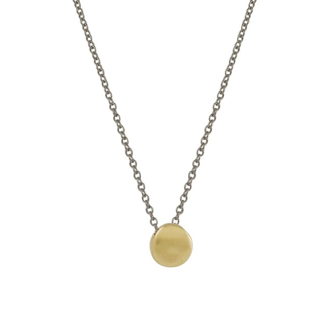 Tiny circle disk in14k gold on a 16" cable chain by Philippa Roberts. Circle charm measures approximately 0.25". Item# 124-31gn/sgn/sgno. Choose from chain materials in 14k gold, bright sterling silver, or oxidized sterling silver.