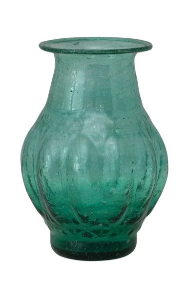 A set of four charming glass vases in different shapes, colors, and sizes. Can be used as a vase for fresh or artificial flowers, or as a decorative piece on its own.