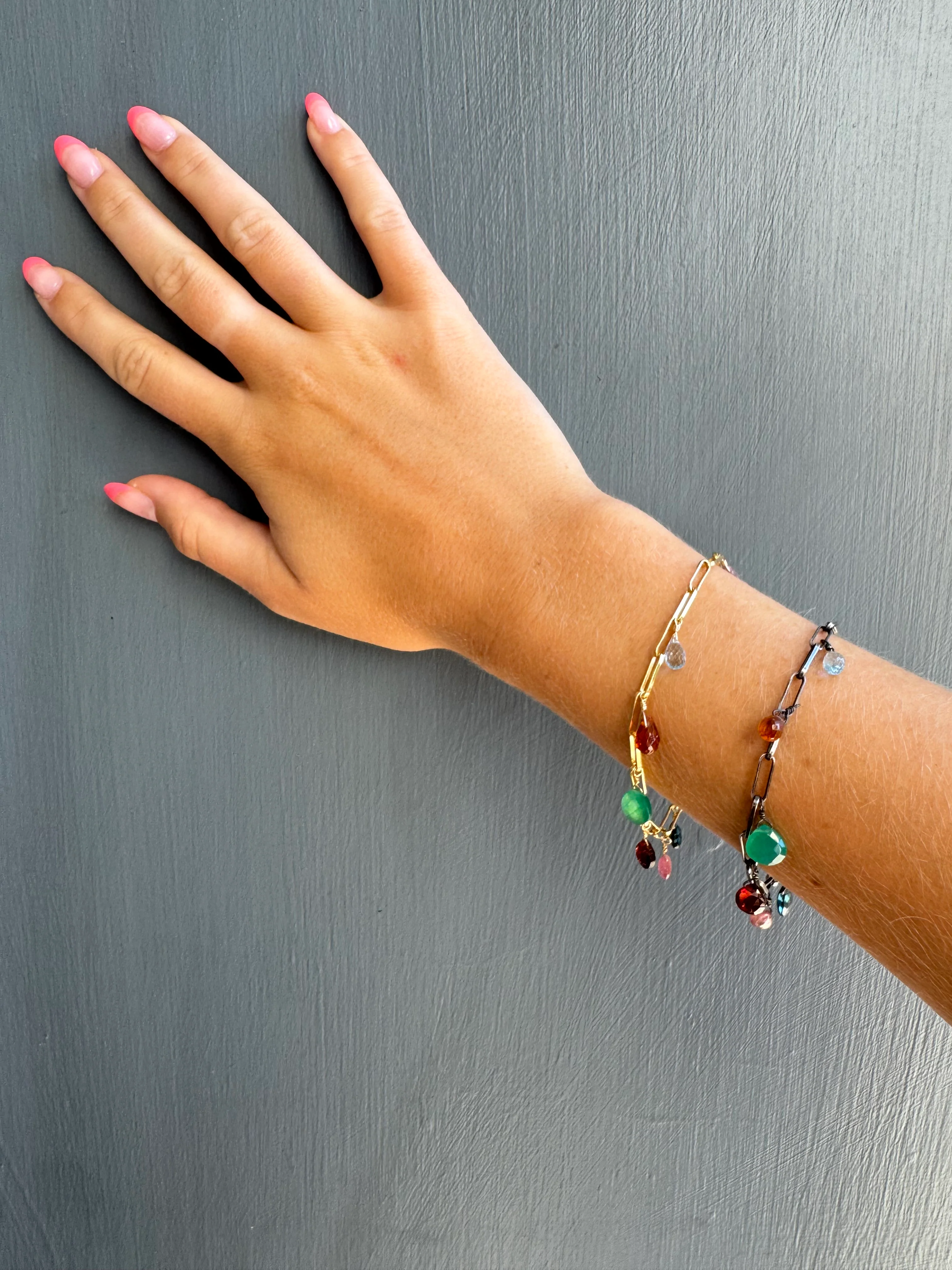 mixed stone chain in silver or vermeil. Bracelet measures approx. 7 1/2" long. Item# 189-04 sb/vb. Our vermeil is sterling silver dipped in 16k gold. Findings are sterling silver and 14k gold fill. Handmade in Oakland, CA