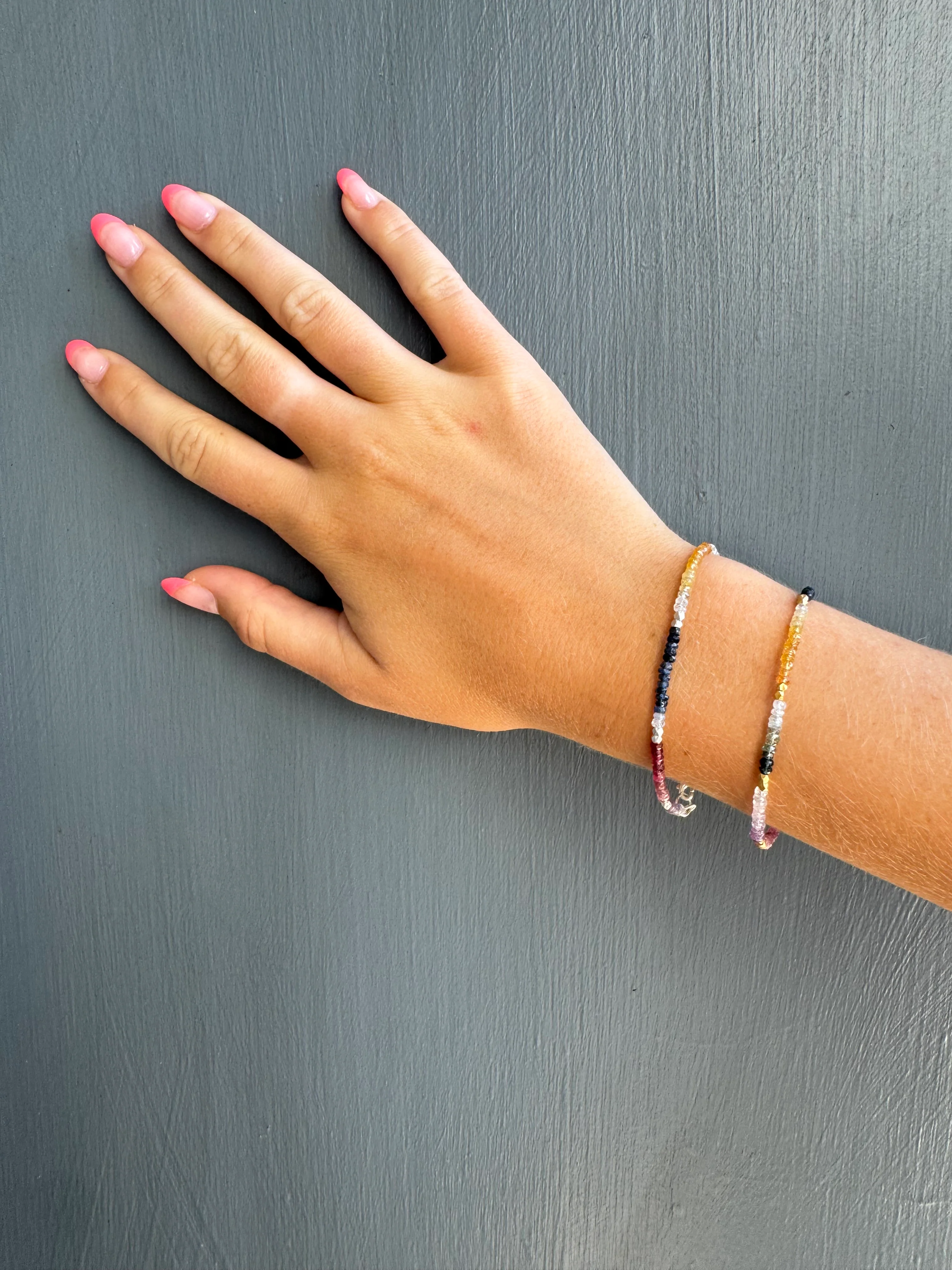 multi sapphire beads in silver or vermeil. Bracelet measures approx. 7 1/2" long. Item# 189-12 sb/vb. Our vermeil is sterling silver dipped in 16k gold. Findings are sterling silver and 14k gold fill. Handmade in Oakland, CA