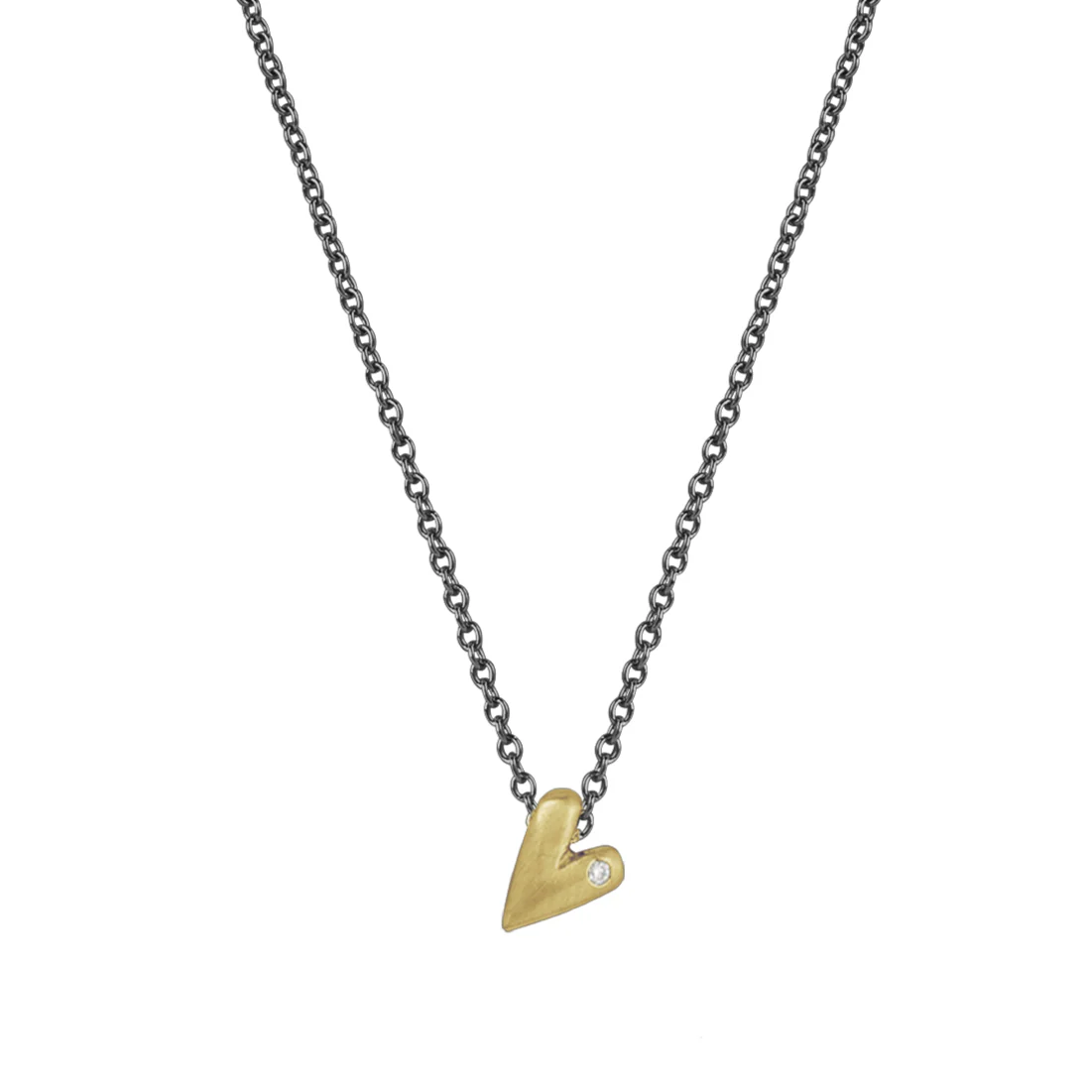 Puffy heart in 14k gold with .02ct diamond necklace by Philippa Roberts. choose from a 14k gold, silver, or oxidized silver 16" chain. pendant hangs approx 3/8". Item# 124-41gdn/sgdn/sgdno. Spruce up your wardrobe with the Philippa Roberts Signature Collection! Featuring some of our most popular pieces in 14k Gold.