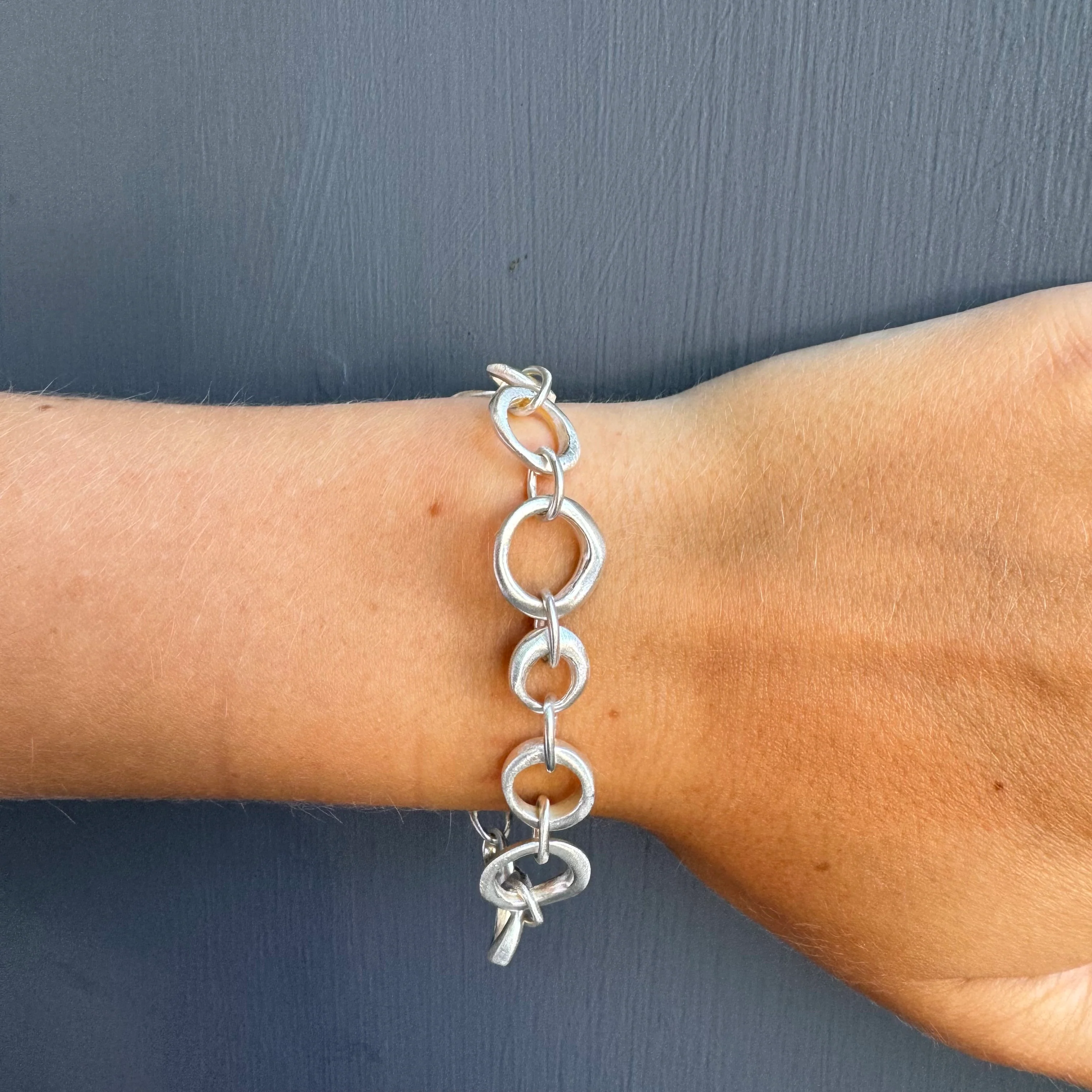 Rings bracelet in sterling silver or vermeil by Philippa Roberts. Bracelet length is approx 7.5 inches long. Item# 467se/ve. Our vermeil is sterling silver dipped in 16k gold. Findings are sterling silver and 14k gold fill. Handmade in Oakland, CA.